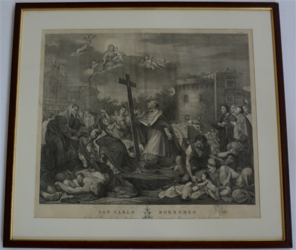 A. Boccabadati "San Carlo Borromeo" incisione in rame dedicata al marchese Raimondo Montecucchi Laderchi (cm 58x64) in cornice (difetti)