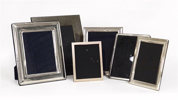 Lotto composto da una cornice portafoto in lamina d'argento e cinque in metallo argentato (difetti)