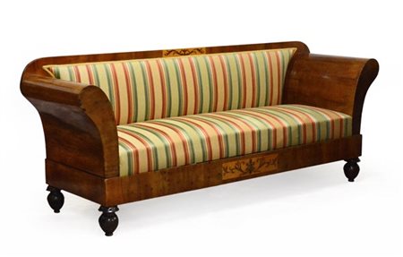 Divano lastronato in noce con schienale e fascia intarsiati a motivi vegetali, braccioli curvi, piedi torniti, secolo XIX (difetti e restauri)