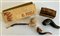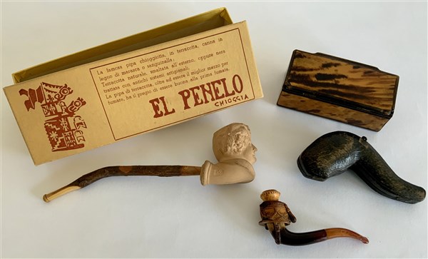 Lotto composto da una pipa chioggiotta in terracotta, una tabacchiera lastronata in tartaruga e una piccola pipa con fornello a forma di cappello da parata, in custodia. Secolo XIX (difetti)
