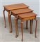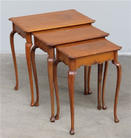 Gruppo di tre tavolini a nido di forma mossa di cui uno con cassettino sottopiano, misure diverse (cm max 55x58x38) (difetti)