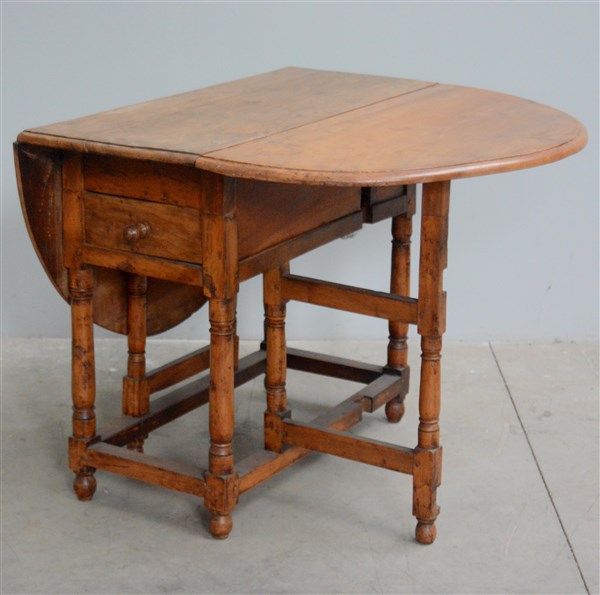 Antico tavolo ad alette in noce con cassetto sottopiano, otto sostegni torniti con traverse dritte (cm 100x80x45) (difetti)
