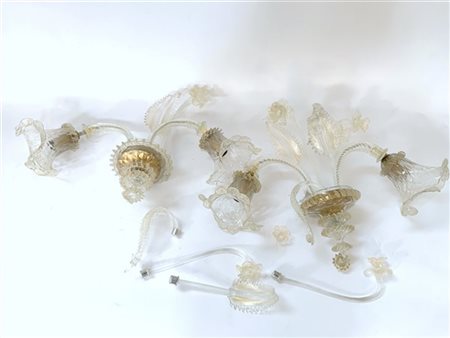 Coppia di appliques a due luci decorate con foglie e fiori in vetro soffiato trasparente incolore con inclusione di foglia d'oro. Secolo XX. (difetti)
