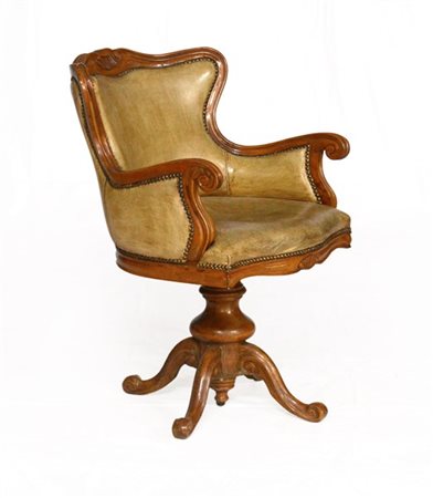 Poltrona girevole rivestita in pelle con schienale intagliato
