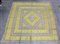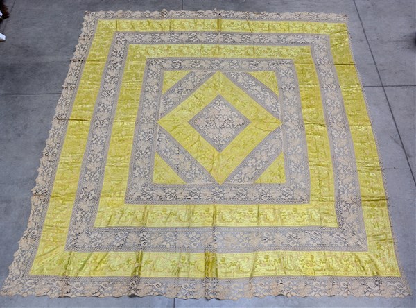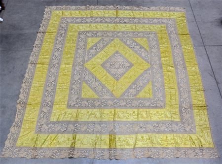 Copriletto confezionato con pizzo al tombolo e strisce di tessuto Jaquard color verde lime e giallo. Italia, inizio secolo XX (cm 280x230)