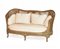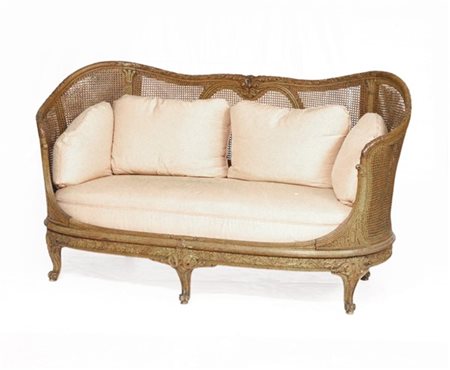 Divanetto da centro a pozzetto in legno intagliato a fiori, foglie e volute, gambe sagomate, rivestito in cannettè (difetti)