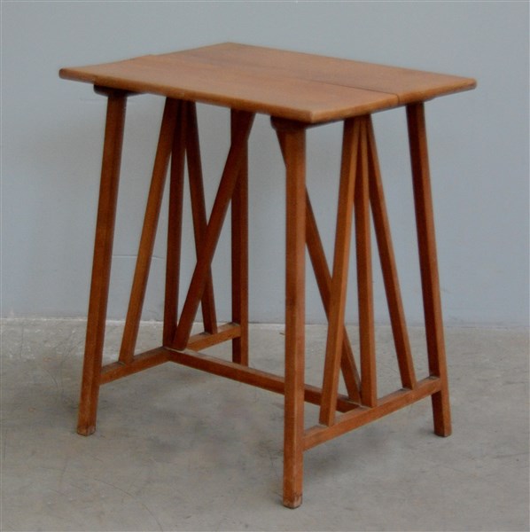 Tavolino d'appoggio in legno con sostegni squadrati a cavalletto (cm 52x60x39,5) (difetti)