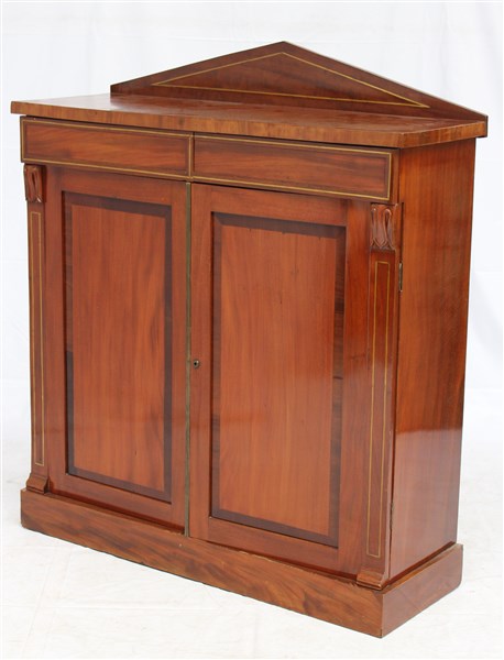 Credenza a due ante e due cassetti con profili e montanti intarsiati in ottone. Inghilterra, inizio secolo XX (cm 107x130x38) (difetti)