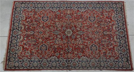 Tappeto meccanico, secolo XX. Decoro floreale su fondo arancio. (cm 194x128) (difetti)