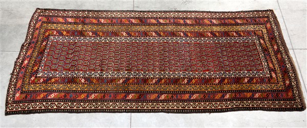 Decoro con file di Boteh su campo rosso. Molteplici bordure di cui quella interna ed esterna a fondo bianco. (cm 272x130) (Difetti)