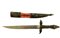 Coltello da caccia con impugnatura in metallo fuso. Fodero in legno ricoperto i