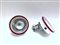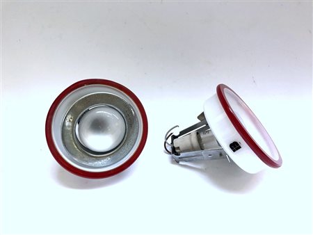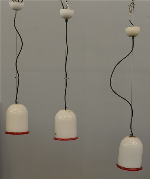 Lotto composto da tre lampade a sospensione in vetro lattimo con bordo in vetro rosso unite a due spot di analoga fattura. (misure diverse) (gravi difetti e mancanze)