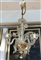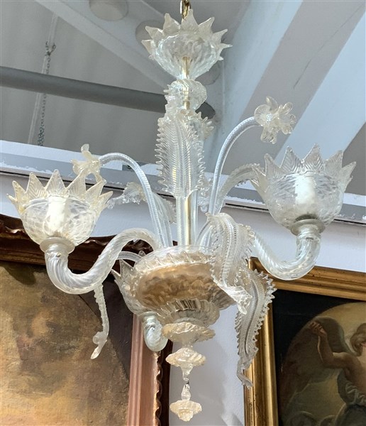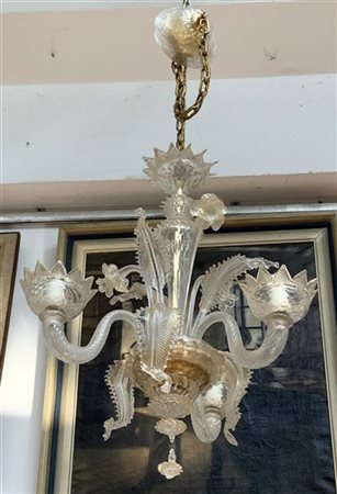 Coppia di lampade a sospensione a tre luci decorate con foglie e fiori in vetro soffiato trasparente incolore con inclusione di foglia d'oro. Secolo XX. (h cm 57) (lievi difetti)
