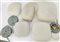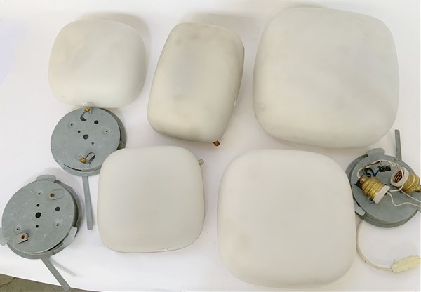 Lotto di cinque plafoniere di misure diverse, con paralume in vetro incamiciato lattimo. Italia, secolo XX. (difetti)