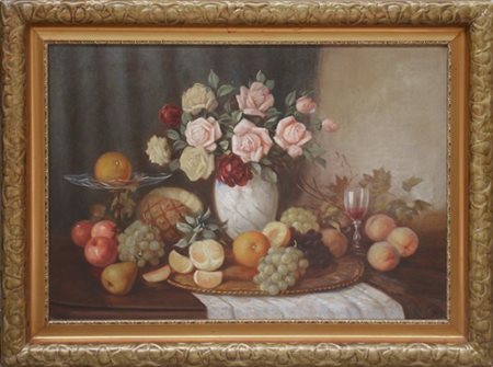 "Fiori e frutta" olio su tela (cm 70x100) Firmato in basso a sinistra. In cornice