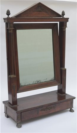 Psiche da tavolo impero di struttura architettonica, colonne laterali tornite, capitelli e guarnizioni in bronzo, un cassetto alla base. Piedini anteriori ferini, secolo XIX (cm 88x54) (difetti)