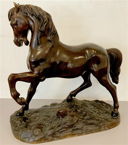 Grande scultura in bronzo raffigurante un cavallo, firmata alla base Barge Fils