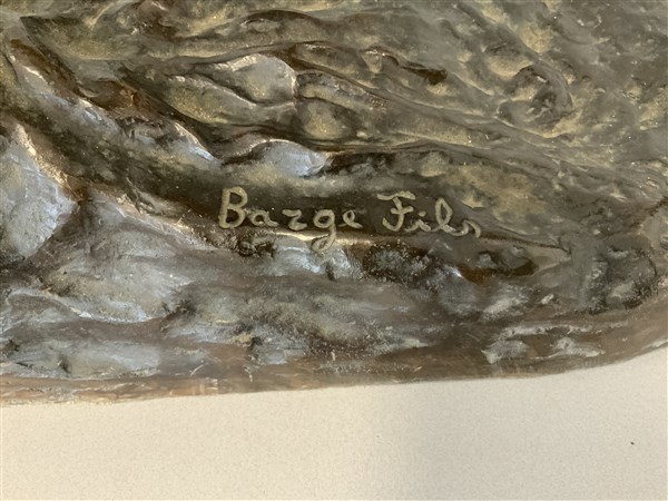 Grande scultura in bronzo raffigurante un cavallo, firmata alla base Barge Fils (cm 83x84x39)