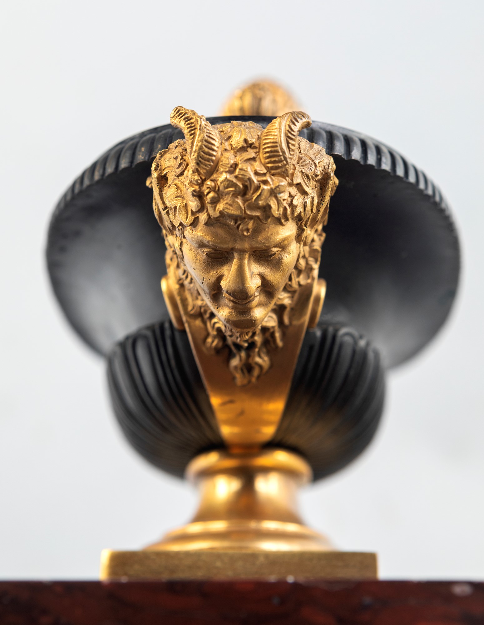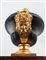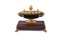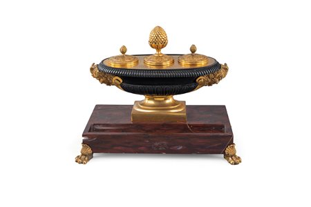Calamaio in bronzo e marmo rosso, Francia 1830 ca. - a forma di navicella brunita caratterizzata da tre vaschette con tappi dorati, abbellita ai lati da volti di satiro finemente cesellati; base rettangolare in marmo rosso griotte con scanalatura portapenne, sorretta da piedi ferini. - cm 20x26x15,5