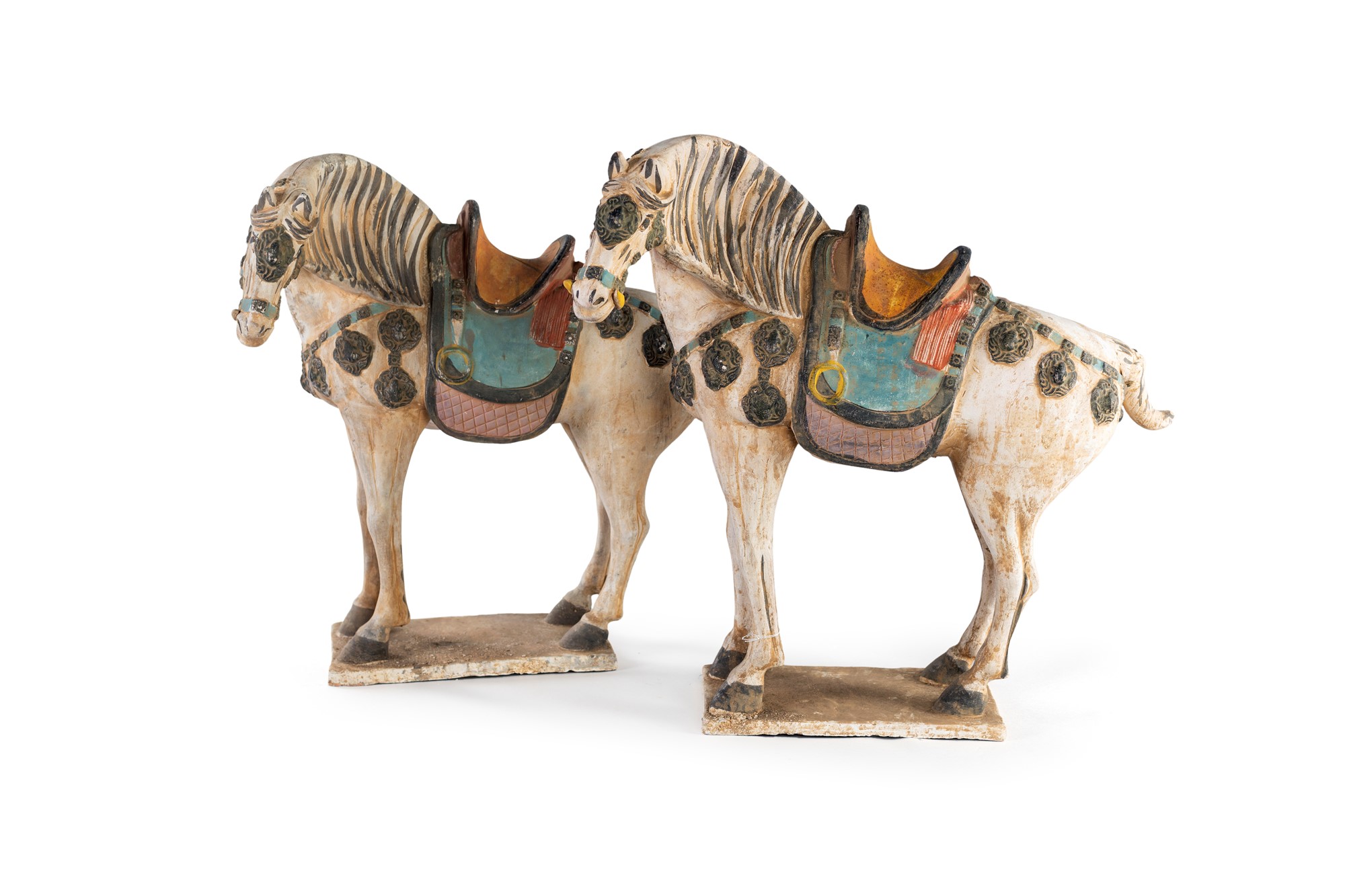 Due sculture in terracotta raffiguranti cavalli, Cina - con tracce di...