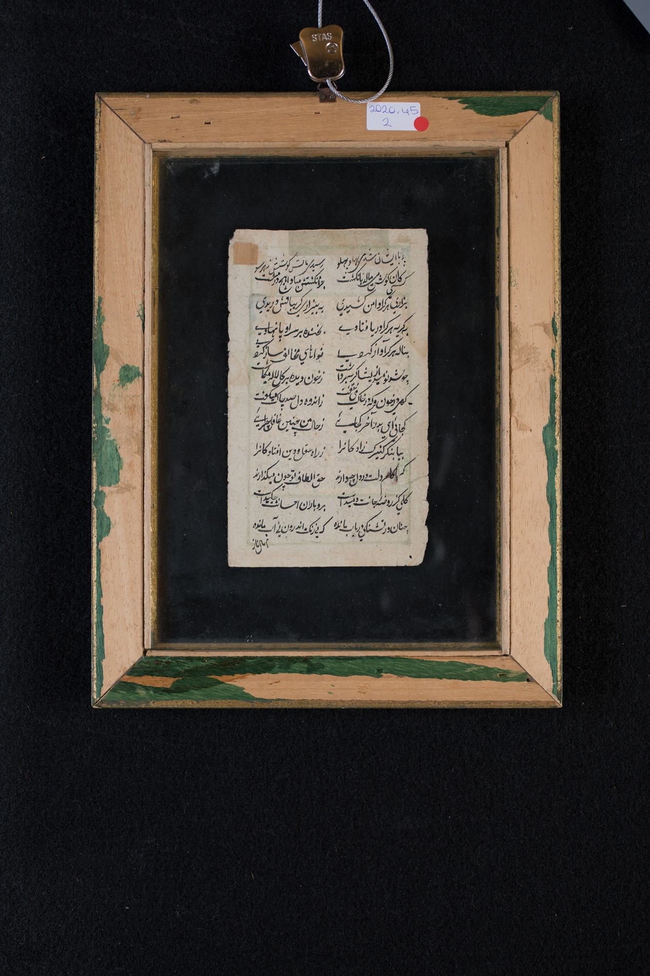Pagina miniata indo-persiana raffigurante una scena galante; al verso ideogrammi. Entro doppiovetro incorniciato. tempera e inchiostro su carta cm 17x10