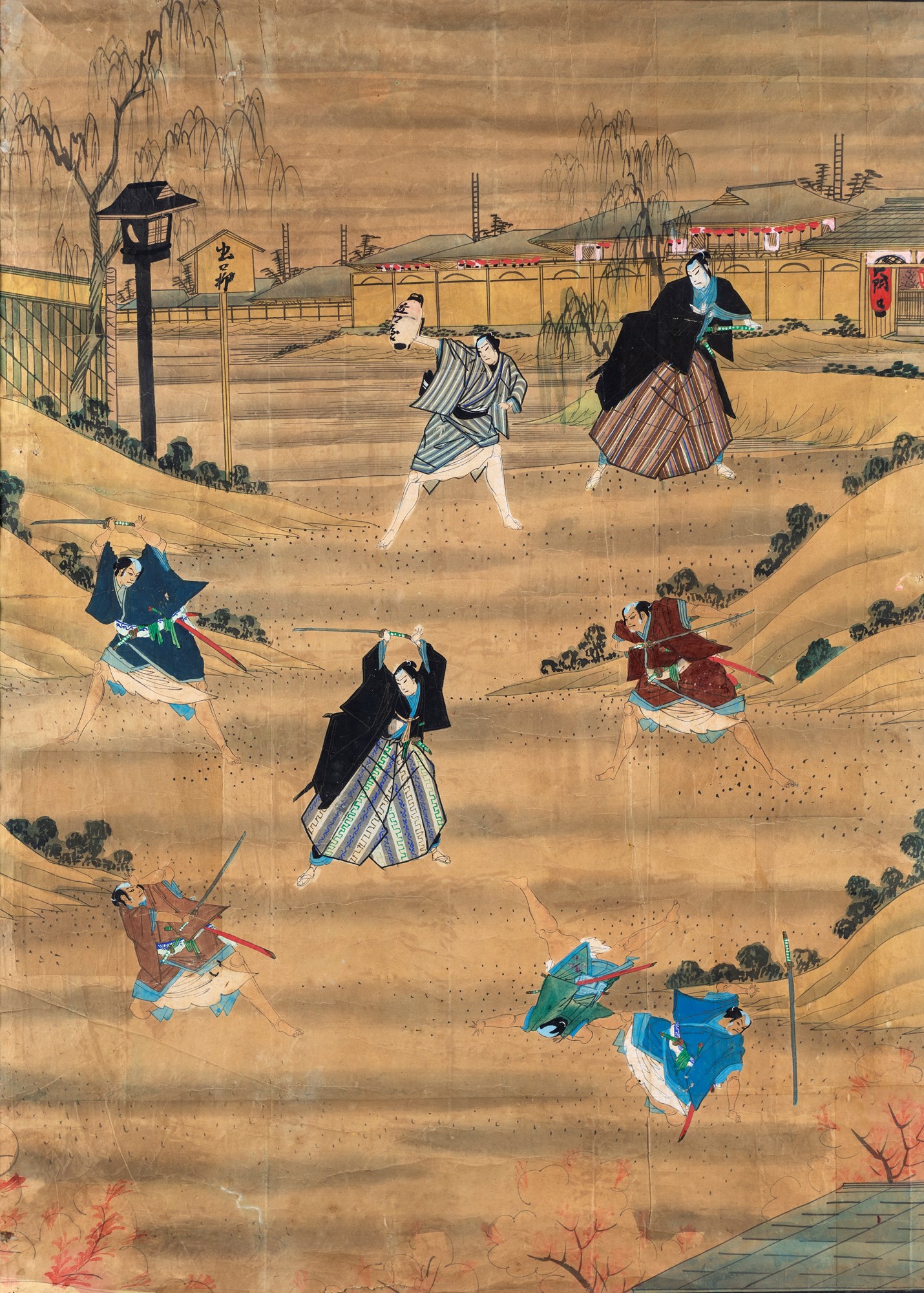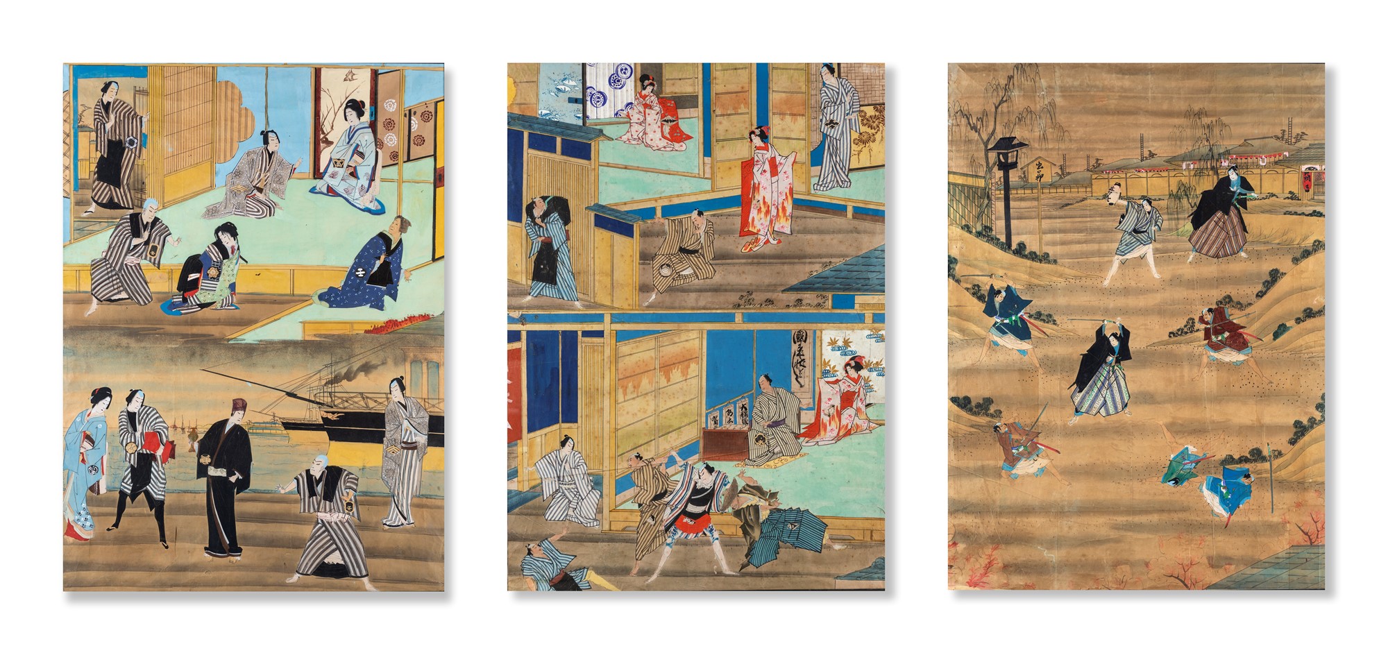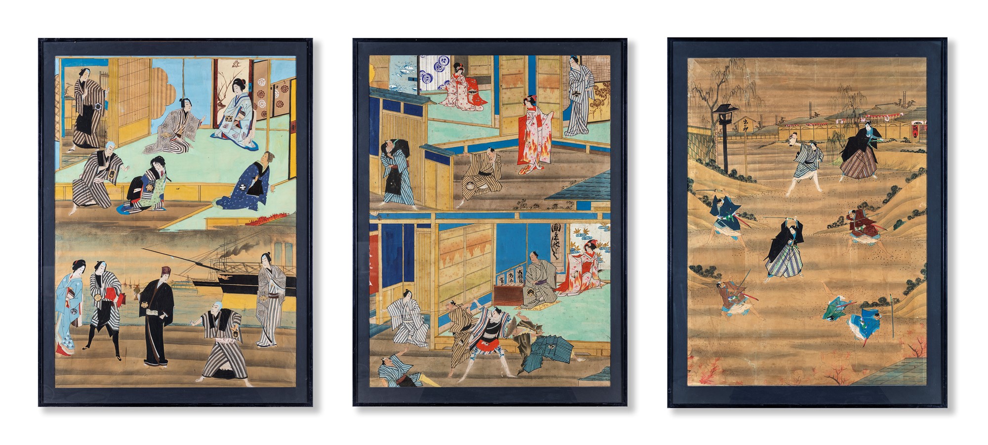 Scene di genere, Giappone XX secolo tre fogli entro cornice. inchiostro e tempera su carta cm 134x100 (con la cornice)