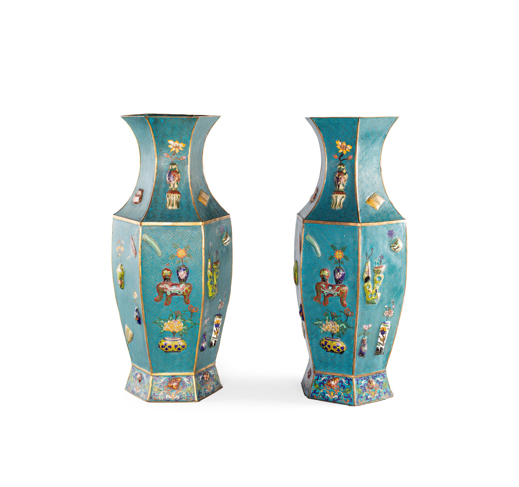 Coppia di vasi in metallo cloisonné, Cina, XIX secolo con corpo a balaustro poliedrico a base esagonale, decorati in rilievo con motivi di buon augurio policromi su fondo turchese. altezza cm 58