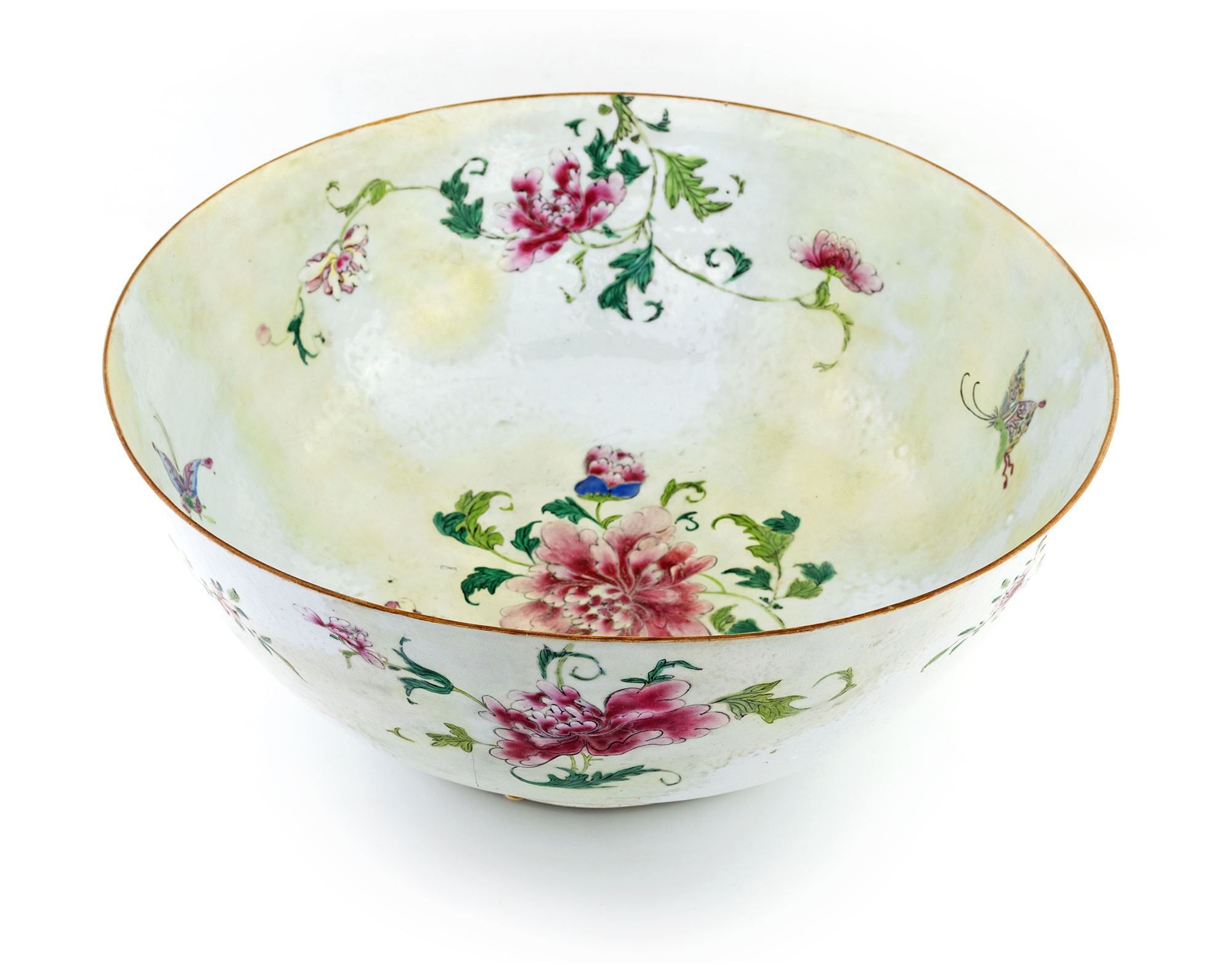 Grande ciotola in porcellana fine, Cina, XVIII secolo decorata nei toni della Famiglia Rosa con grandi peonie. Restauri. cm 17x39