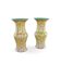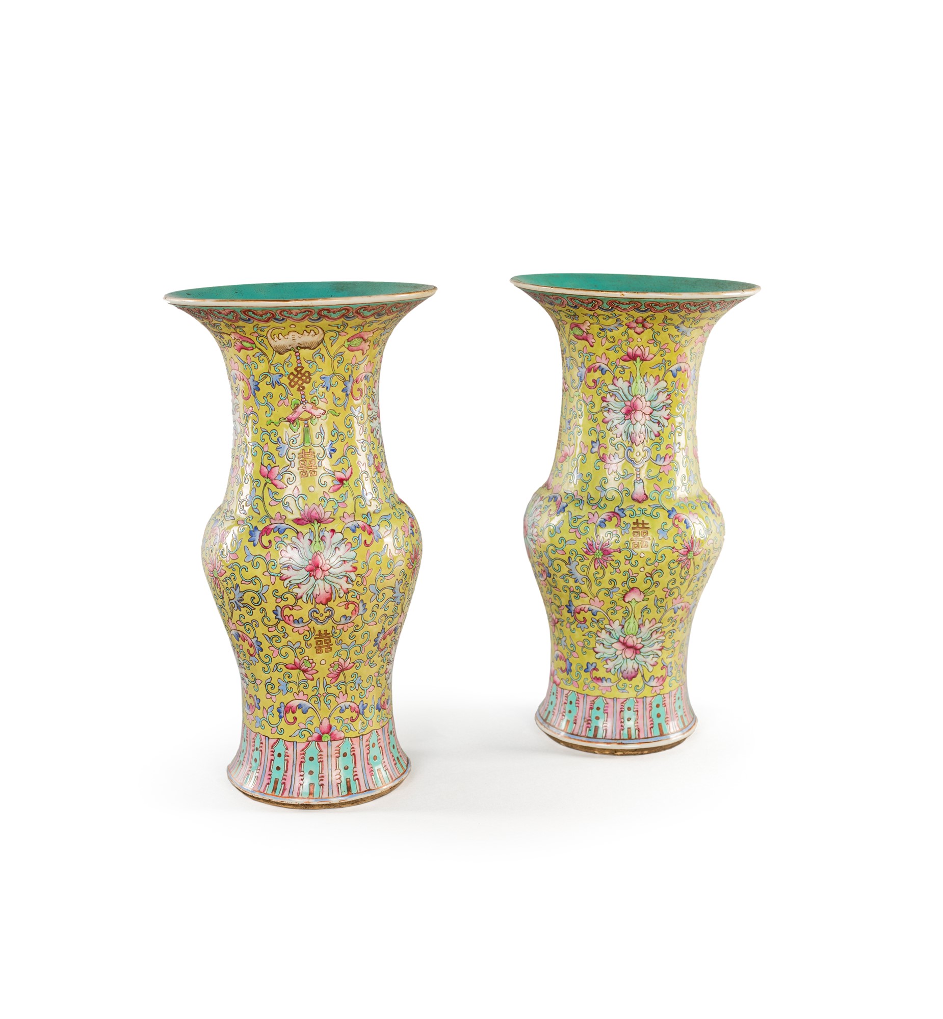 Coppia di vasi in porcellana, Cina, XIX secolo di forma sagomata con fitta decorazione su fondo giallo da cui spiccano grandi fiori di peonia. altezza cm 41
