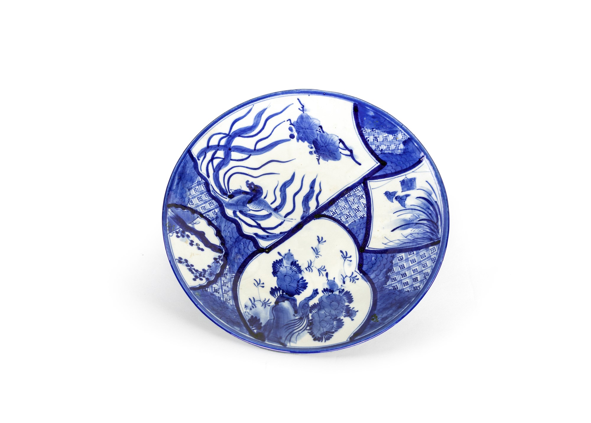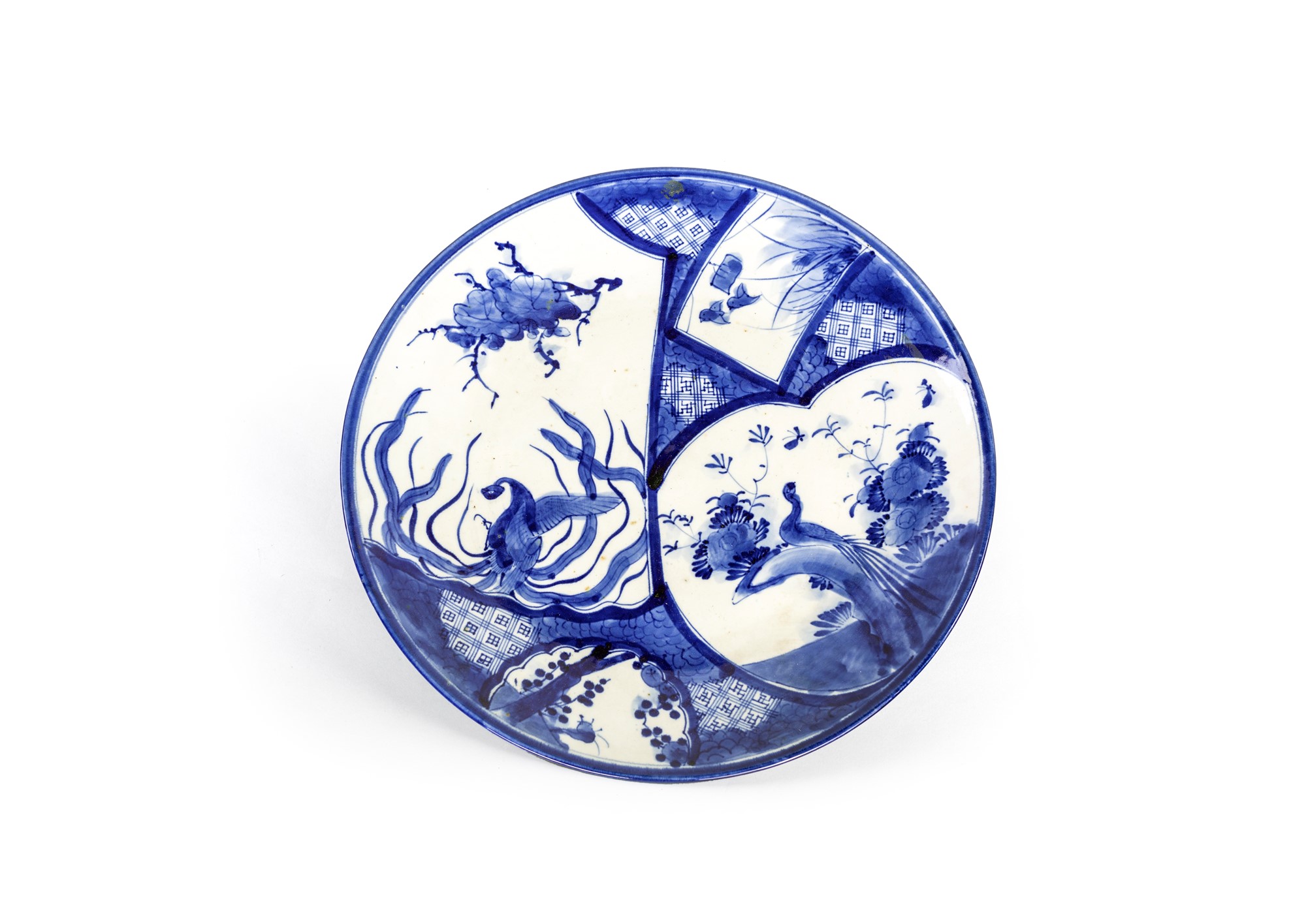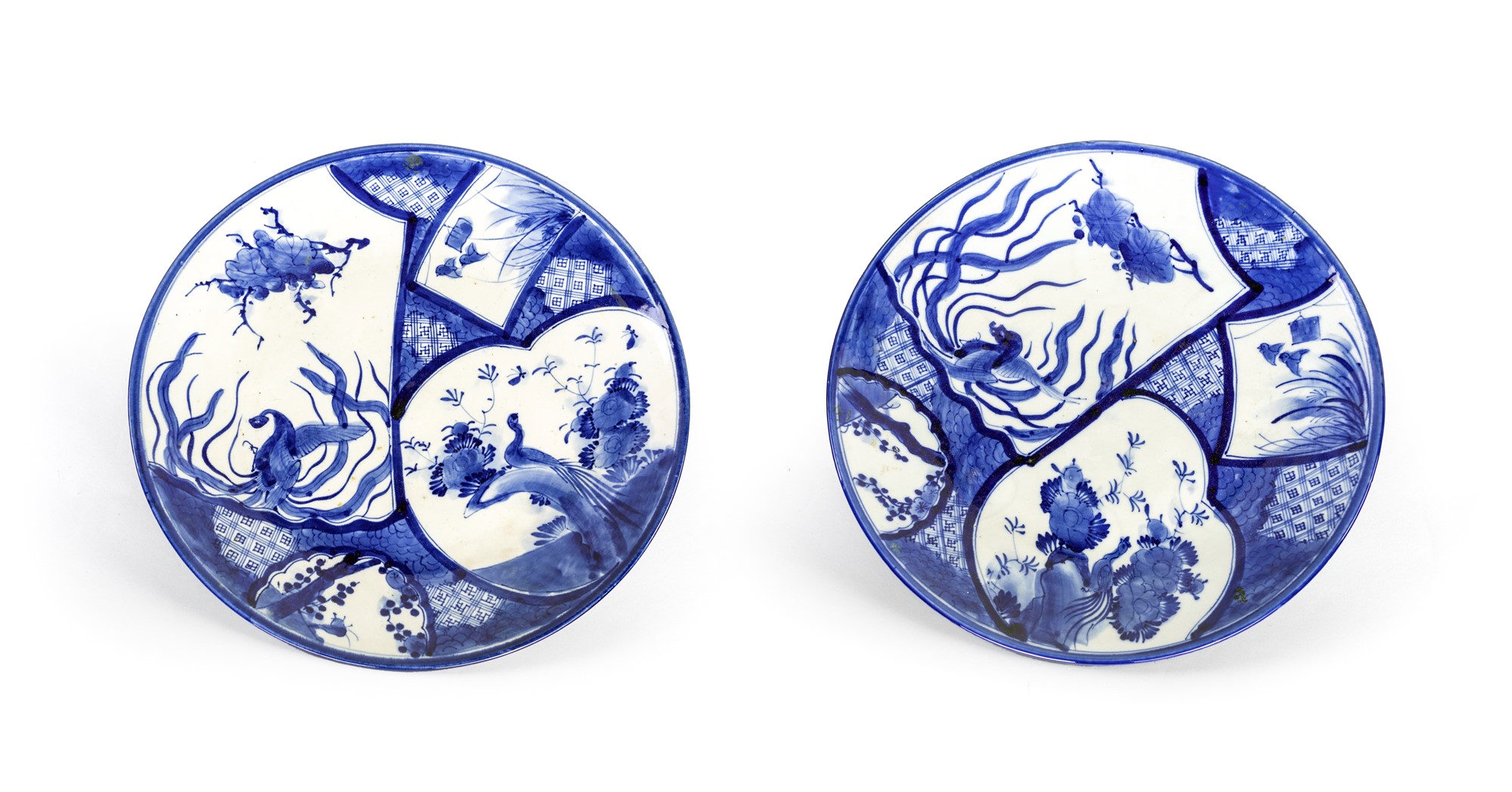 Coppia di piatti in porcellana bianca e blu, Cina decorati a riserve multiformi con vegetazione palustre e boschiva su sfondo geometrico. diametro cm 48