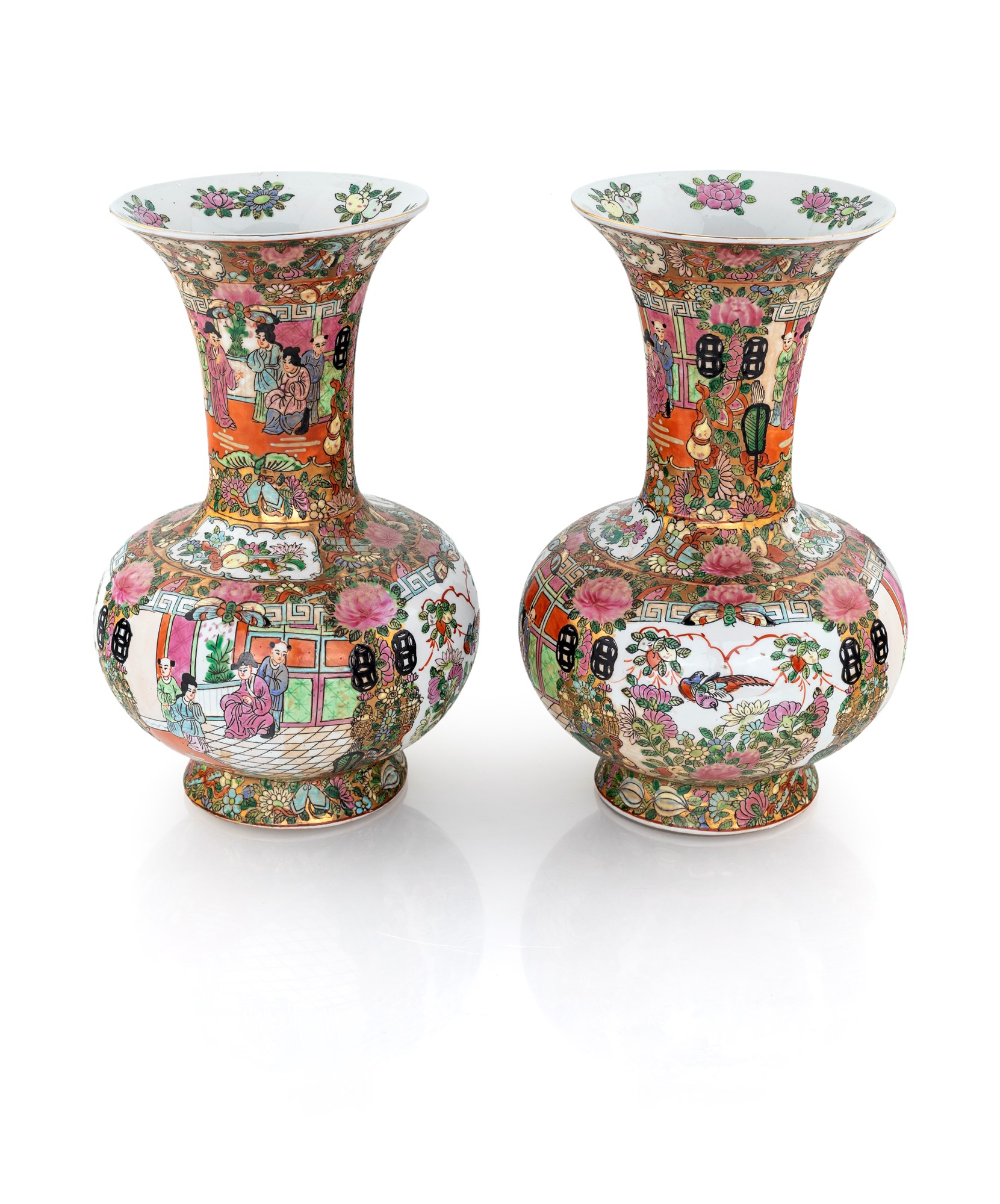 Coppia di vasi in porcellana, Cina decorati in vivace policromia con scene di genere; corpo sferico con alto collo e bocca espansa. altezza cm 31