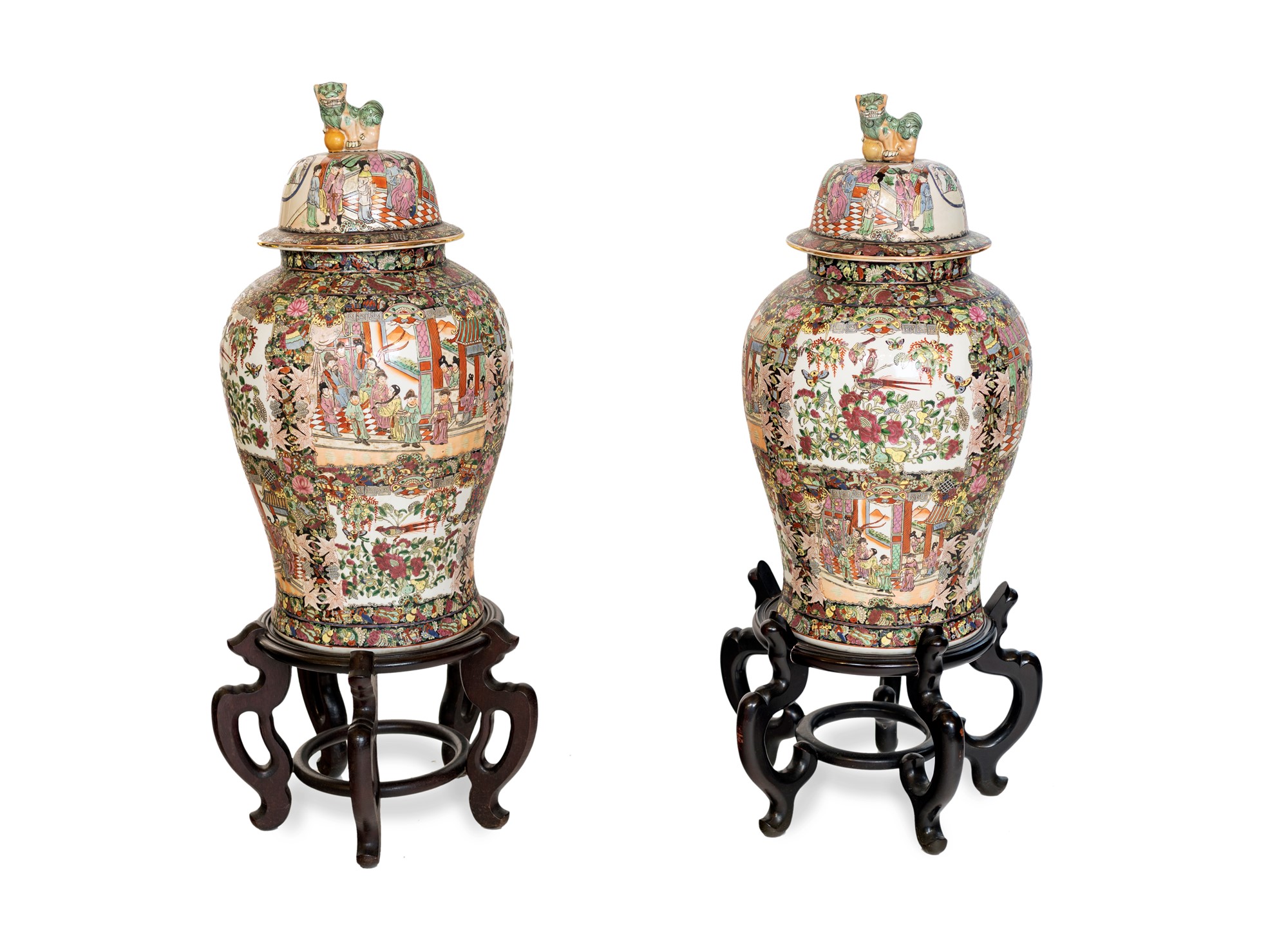 Coppia di potiches in porcellana di Canton, Cina, XX secolo con vivace decorazione a scene di genere alternate a composizioni naturalistiche; coperchio a cupolino sormontato da cane di Pho, sostegno in legno. cm 110x40