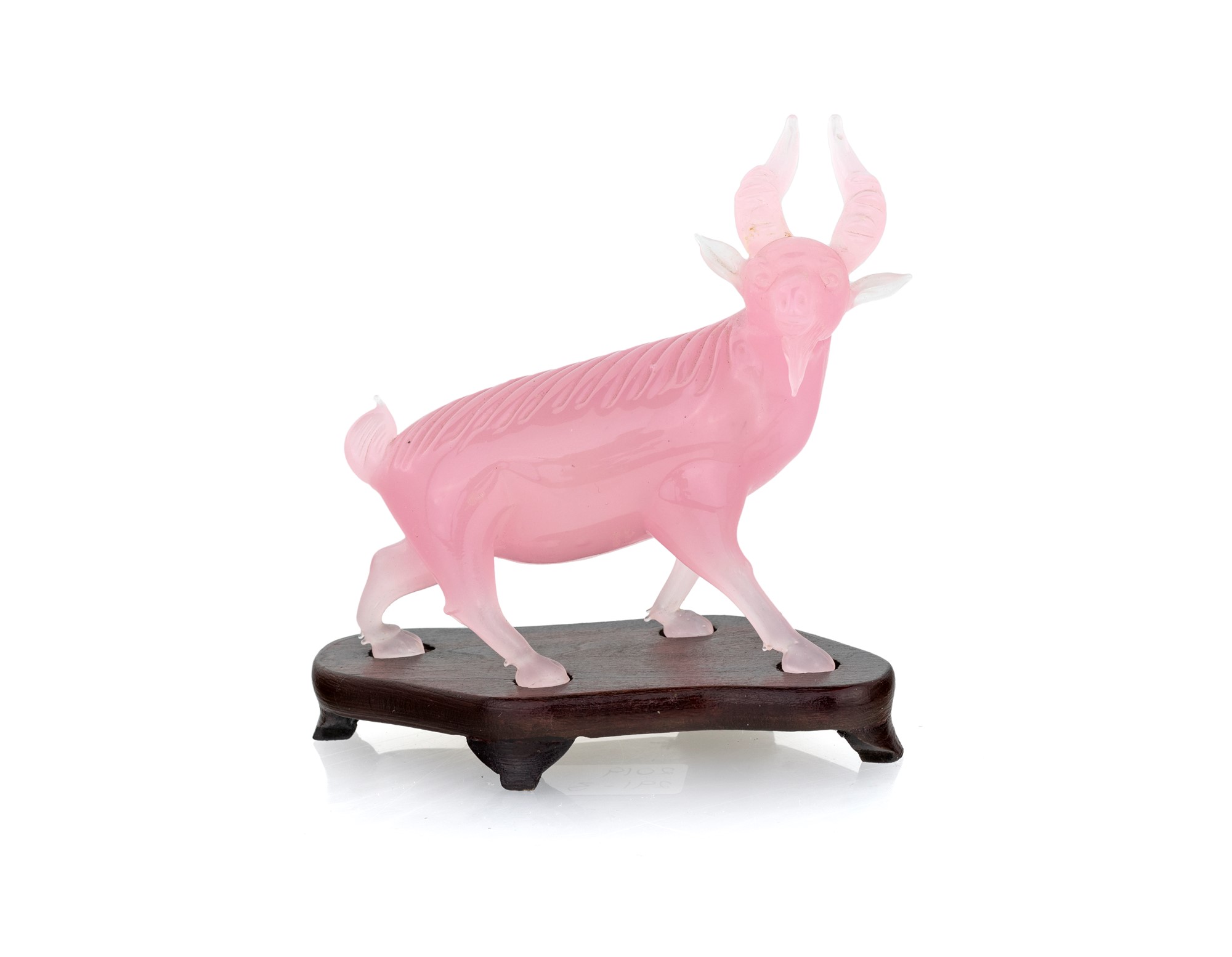 Caprone in quarzo rosa su base in legno. cm 10,5x11x3