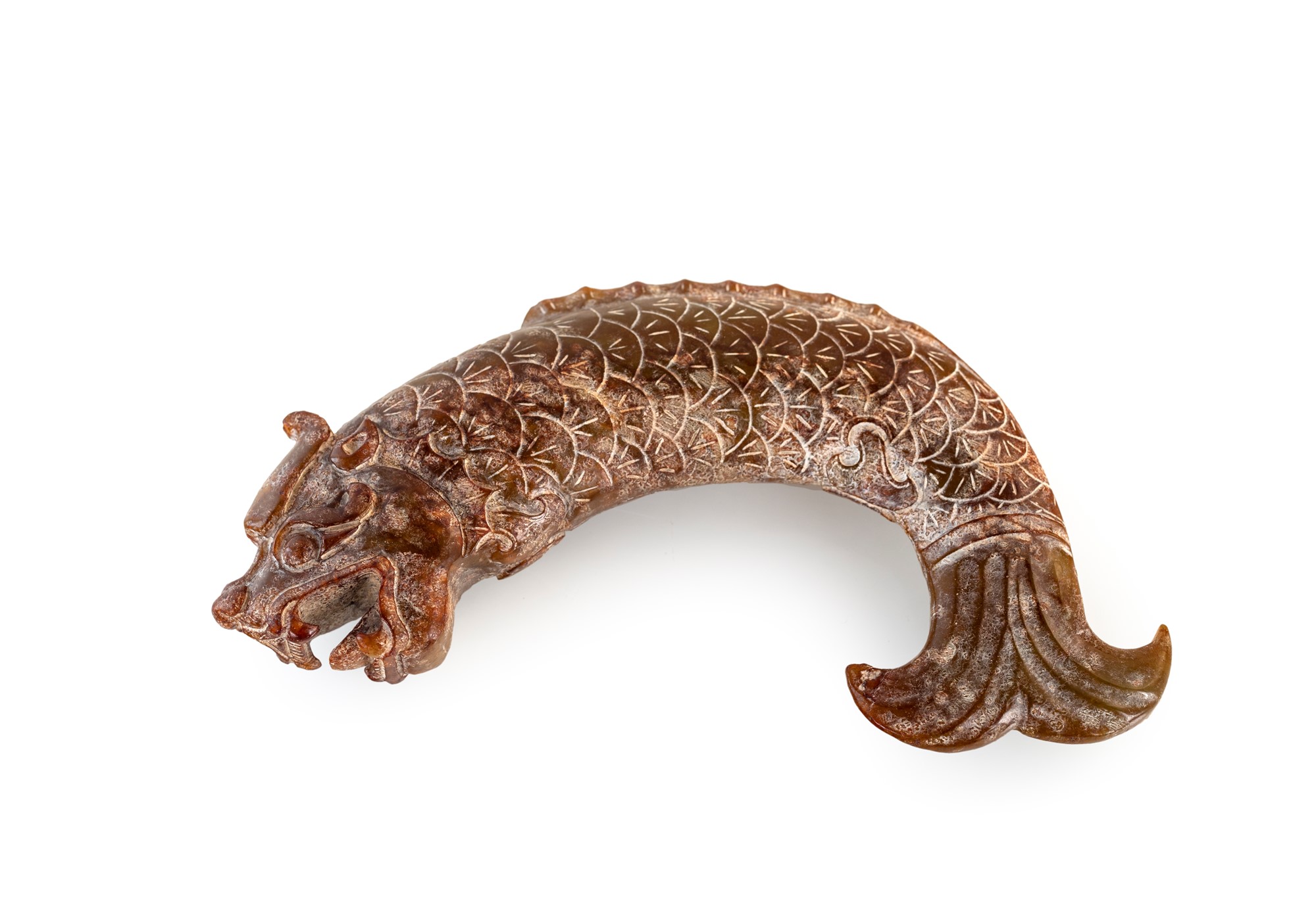 Intaglio in pietra dura raffigurante un pesce con testa di drago. cm 10x18 ca.