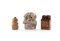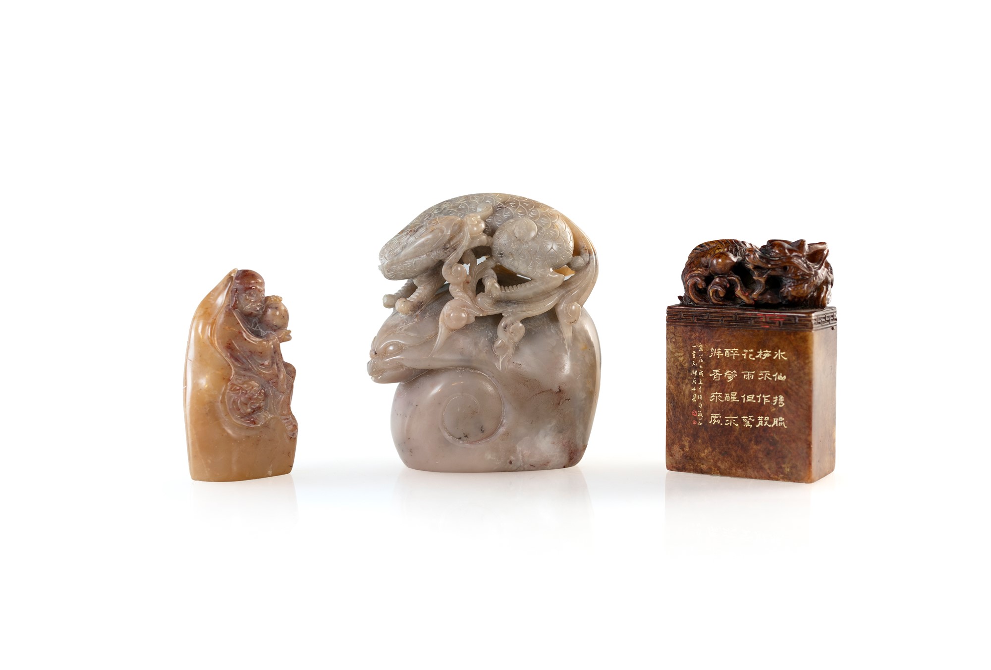 Tre sigilli in pietra dura caratterizzati rispettivamente da una figura seduta su un drago, da un animale fantastico sormontato da un drago ed uno di forma squadrata con drago sulla sommità. altezza cm 6,5 - cm 7,5x5x2,8 - cm 9x8x3,5 rispettivamente