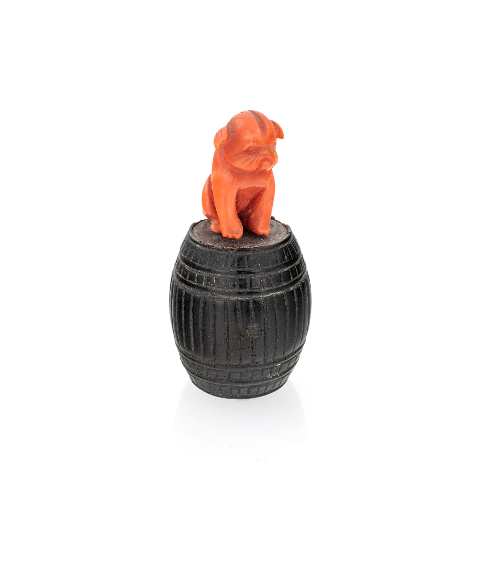 Piccola scultura in corallo cerasuolo raffigurante un cane seduto su una botte in legno altezza cm 2 - complessiva cm 5