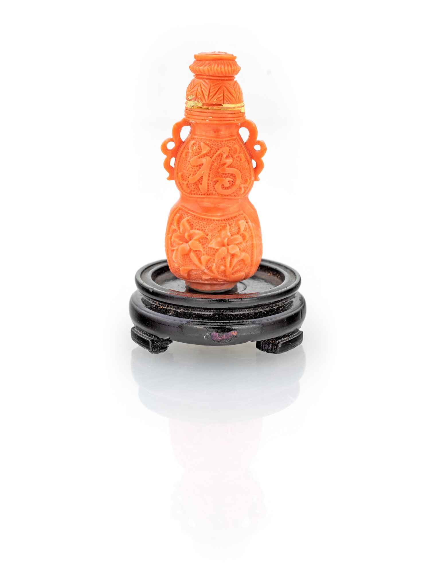 Snuff bottle in corallo cerasuolo decorato da lievi intagli a motivi floreali ed ideogrammi; tappo a cupolino, piccole anse geometriche traforate. altezza cm 6,5 - gr. 50