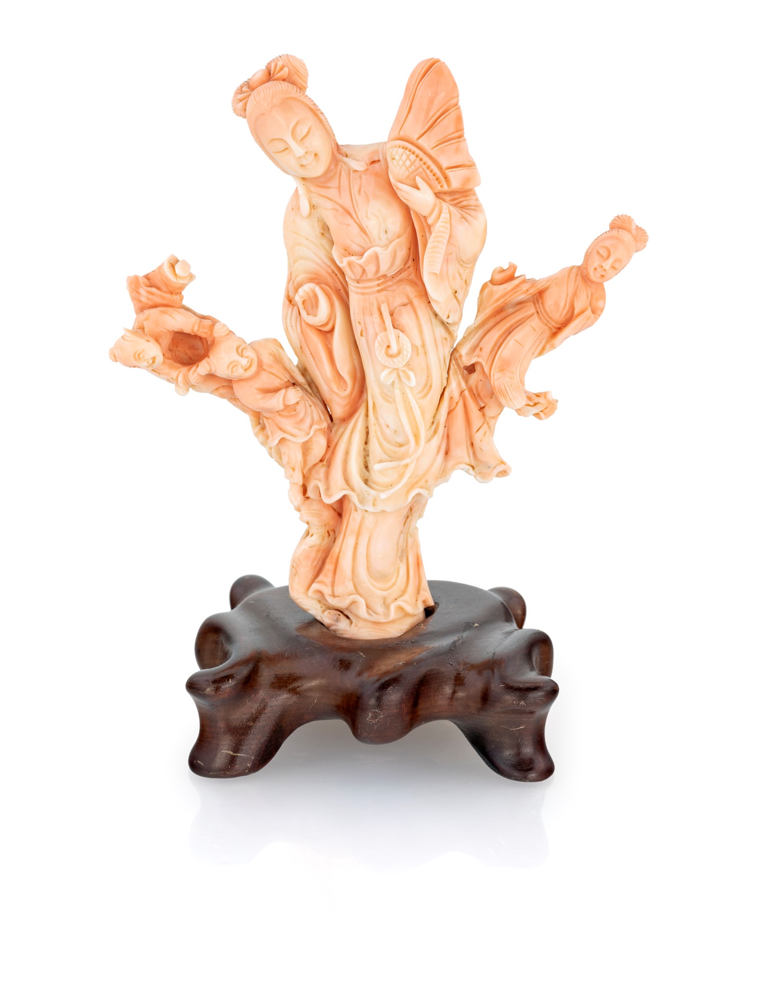 Gruppo in corallo rosa minuziosamente intagliato; al centro una geisha con ventaglio affiancata da due piccole figure di giovani; base in legno.  cm 17,5x15,5 - gr. 422