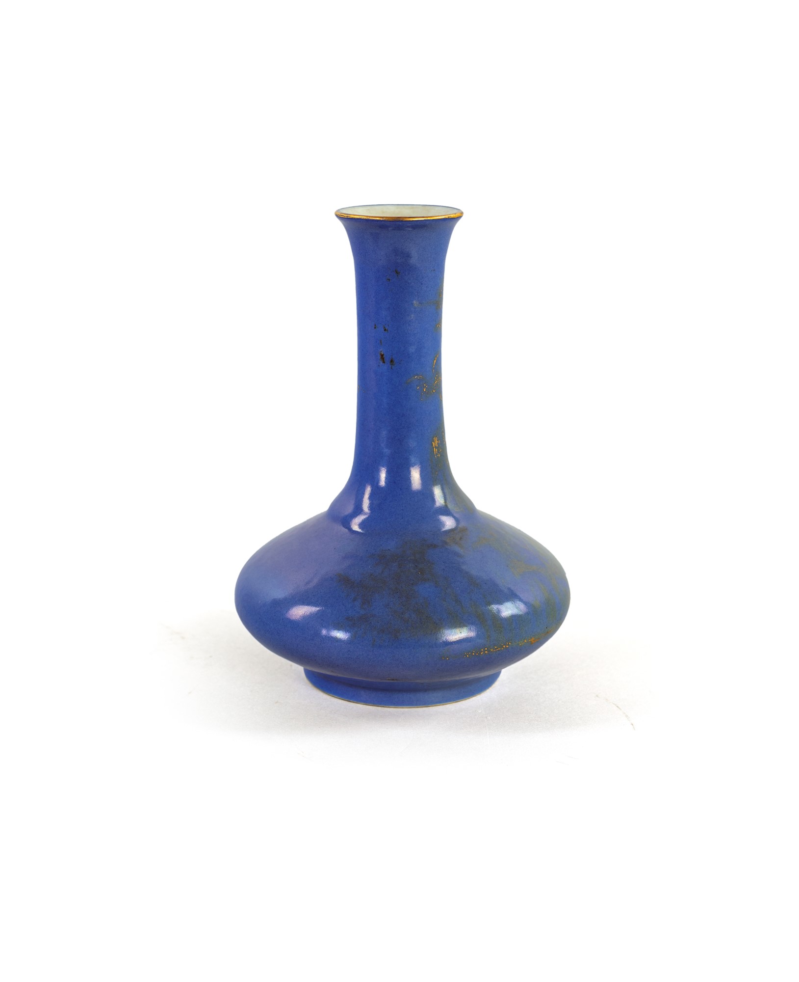 Piccolo vaso in porcellana monocroma azzurra, Cina dinastia Qing di forma globulare piatta con lungo collo cilindrico; tracce di ideogrammi in oro sul collo. altezza cm 22