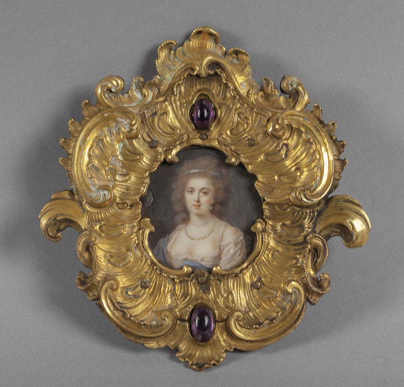 Gentildonna con collana di perle miniatura su avorio f.ta Rodger e d.ta 1782 bella cornice in rame sbalzato e dorato di epoca