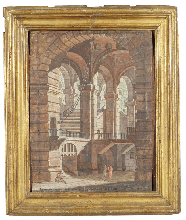 Scuola emiliana sec.XVIII 'Architettura con figure' tempera su carta cornice coeva in legno intagliato e dorato