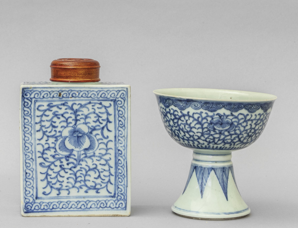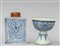 Bottiglia e coppa in porcellana di Cina bianca e blu sec.XIX
