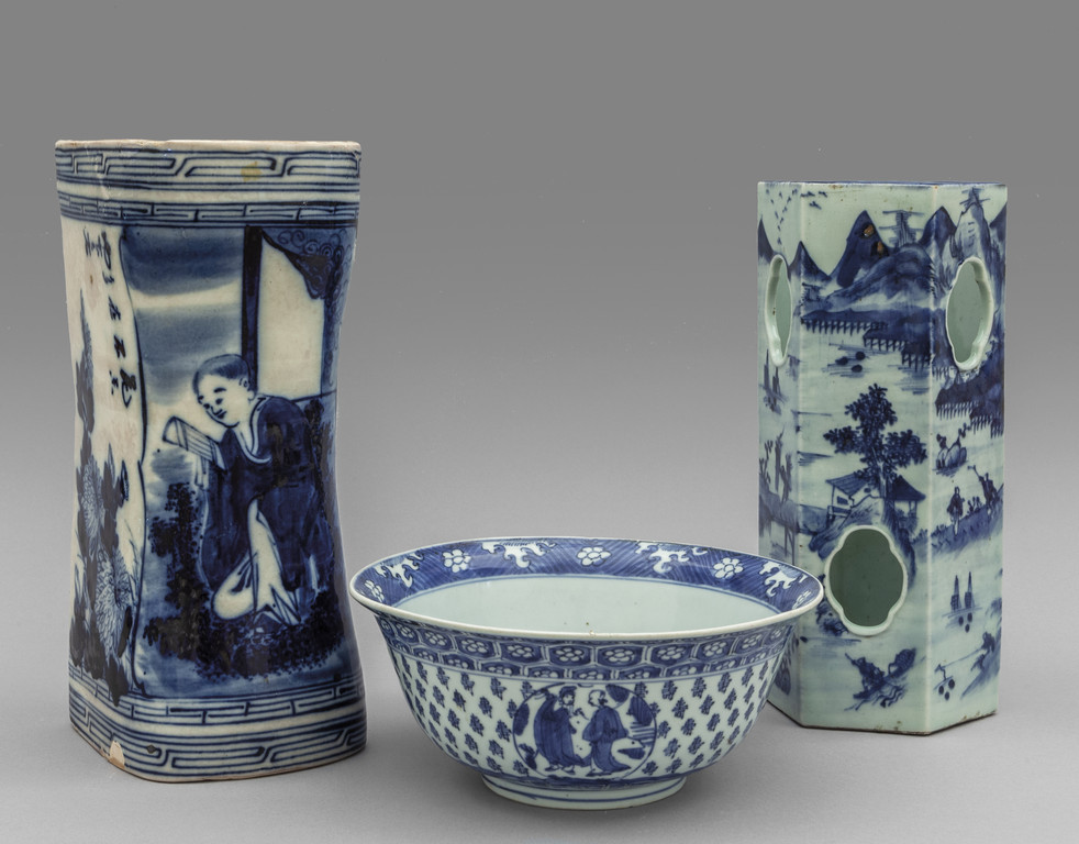 Tre oggetti diversi in porcellana di Cina bianca e blu
