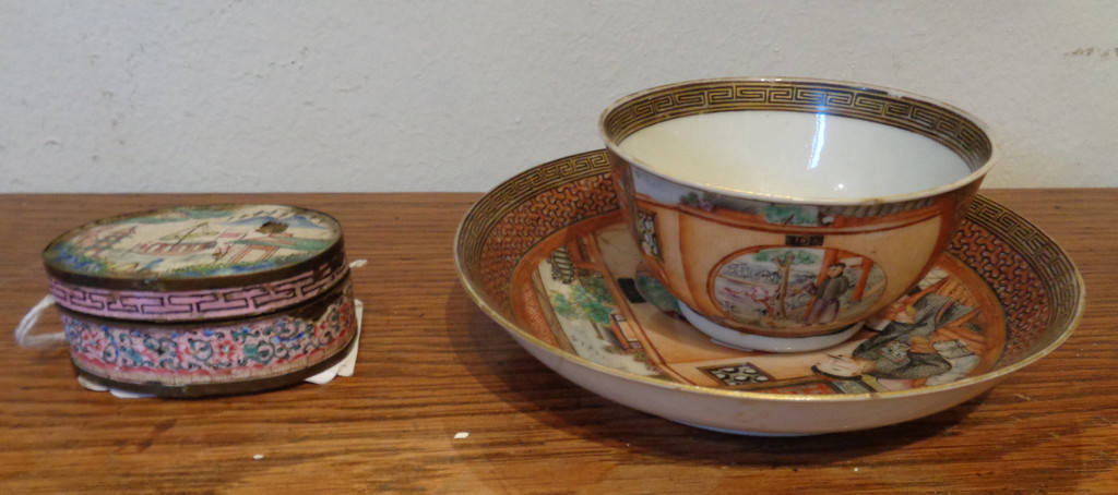 Scatoletta in smalto con decorazioni orientali e tazzina con piattino in porcellana di Cina