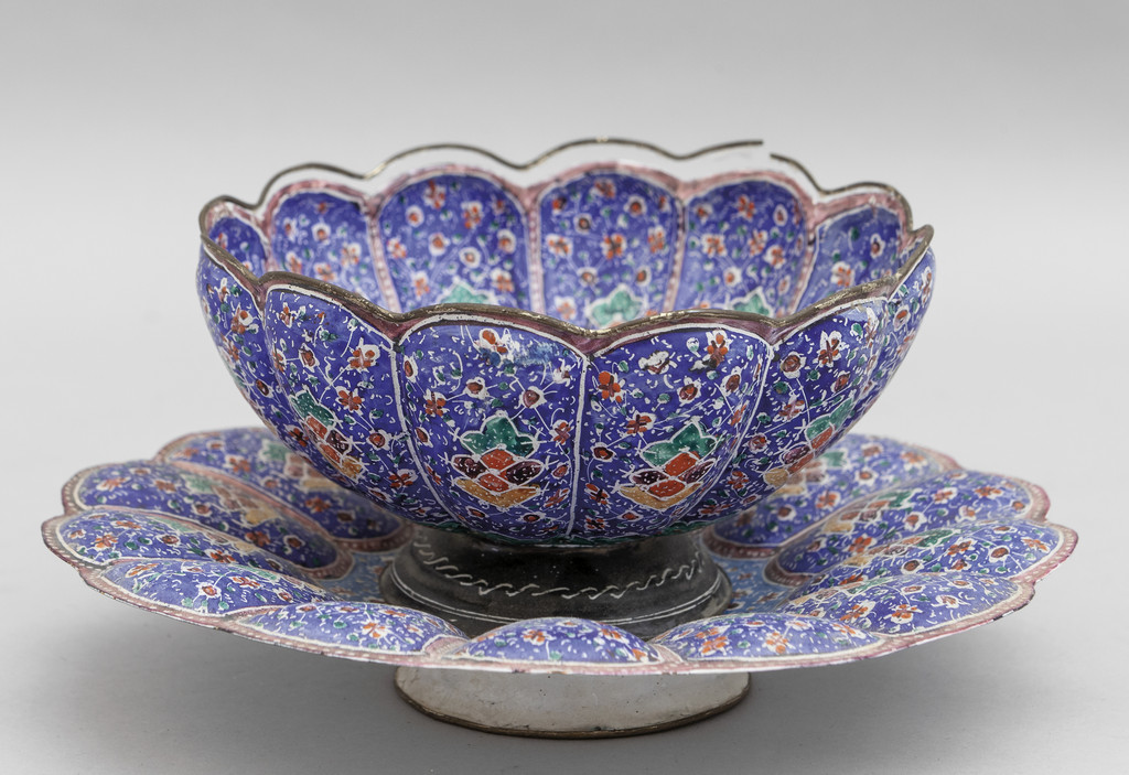 Coppa con piatto in metallo smaltato a fondo blu Persia sec.XIX