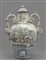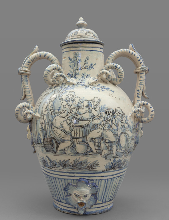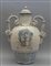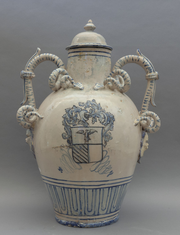 Grande vaso con coperchio in ceramica bianca e blu decorata con figure e stemma manici a forma di serpente Centro Italia sec.XIX