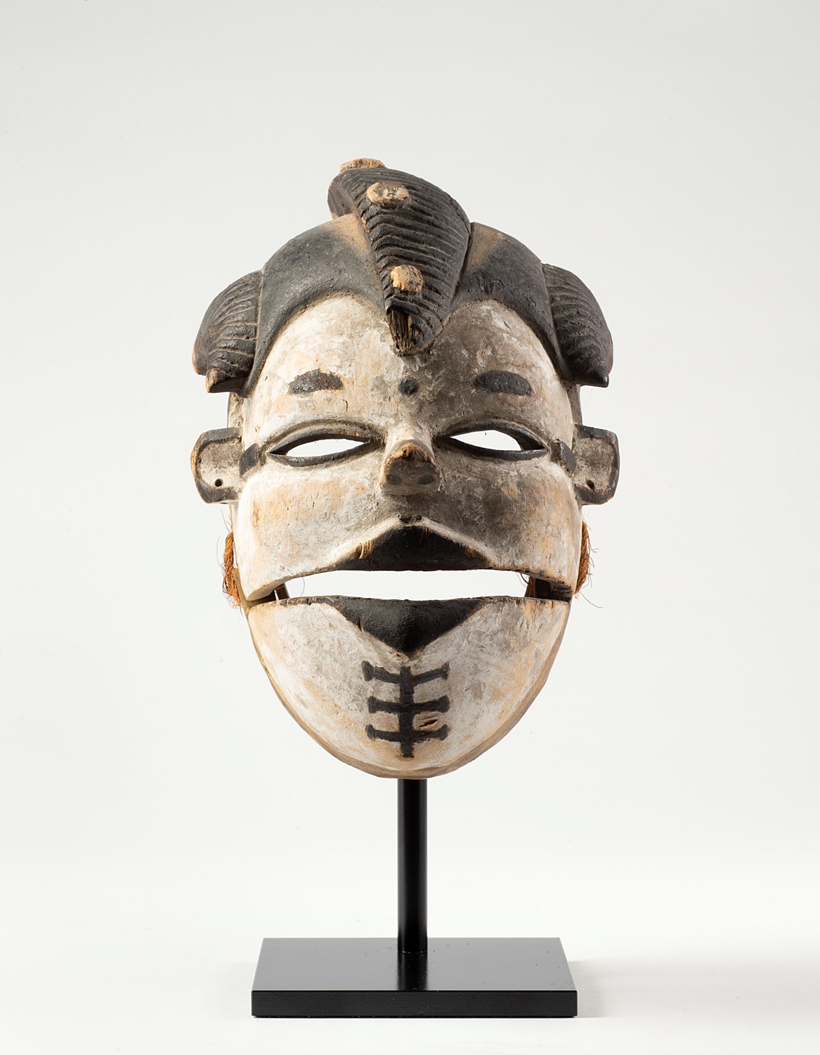 Maschera riservata alle danze allegoriche dipinta con un impasto di vernice biancastra e decorazioni nere. Un naso regolare divide le fessure degli occhi tagliate ad ogiva. La bocca, a labbra dilatate, è divisa nei due settori che rendono la mandibola disarticolata e mobile. Una corda di rafia tiene ancora legate le due parti. Il mento e le tempie sono segnati con i simboli caratteristici del clan. L’elaborata pettinatura nera è divisa in piccole ciocche segnate da incisioni a linee parallele. Quella centrale, più grande, si distingue per una serie di bottoni dipinti di bianco.