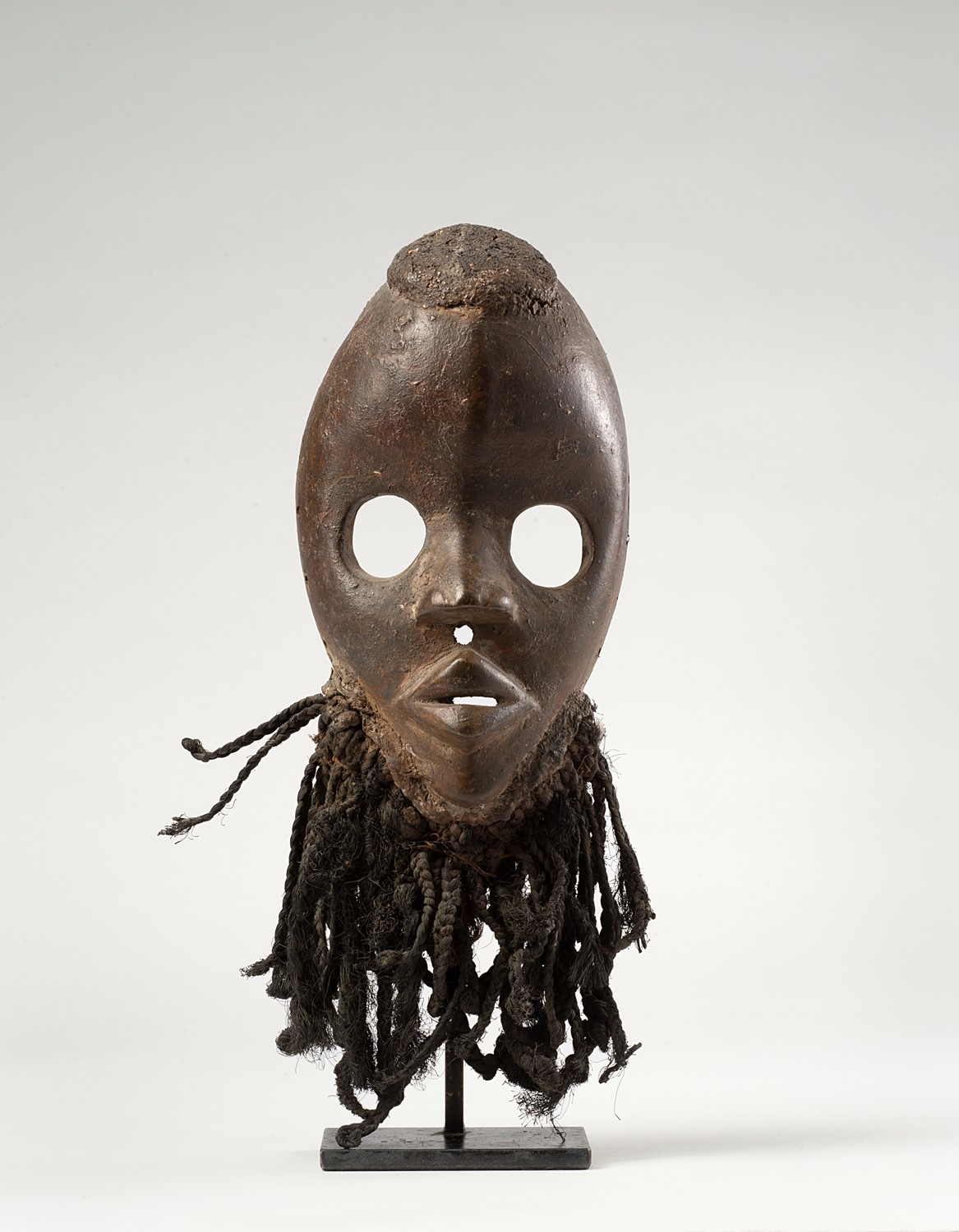 Appartiene ai modelli diffusi tra i gruppi Dan, Mano, Yacouba, Guerzè, che vivono nella regione forestale ai confini di Costa d’Avorio, Guinea e Liberia.Il viso è scolpito in un ovale perfetto dove l’asse verticale in rilievo lo divide in due settori simmetrici. La bocca è formata da due grosse labbra socchiuse, il naso regolare divide la zona dei grandi occhi circolari, la barba di fibre intrecciate completa la silhouette della maschera. Sulla testa è presente un grosso impasto di materiale associato alle pratiche divinatorie del proprietario. Questi continui trattamenti hanno lasciato tracce evidenti sulla superfice del legno.