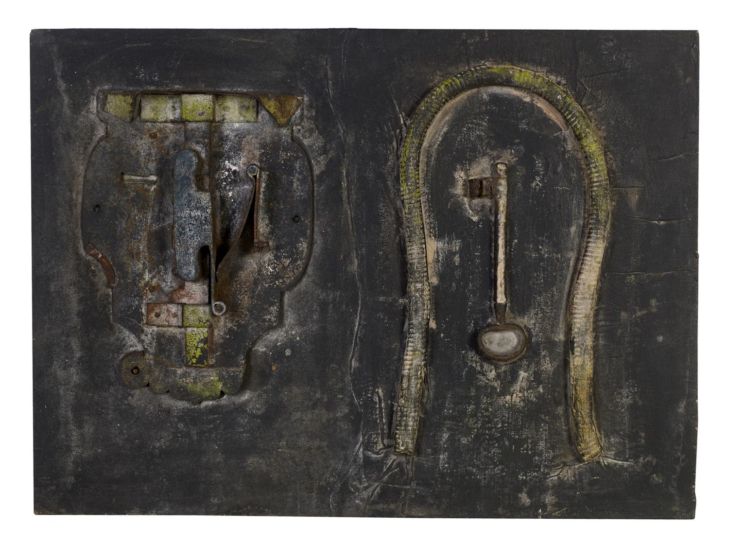 Gianfranco Baruchello DONNA/CHIAVE media diversi su legno, cm 50,5x69,5x10...