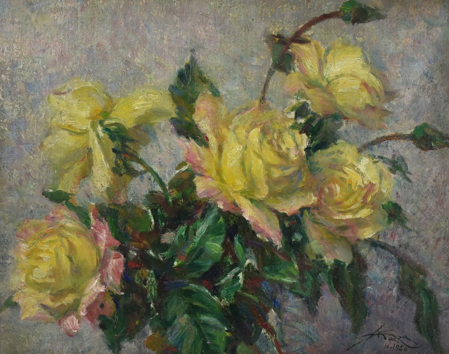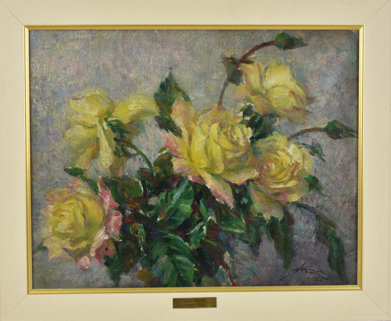 Aldo Mazza MAZZO DI ROSE GIALLE olio su masonite, cm 42x32,5 firma e data sul...